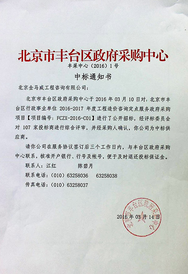 3月10日,北京市豐臺區行政事業單位2016-2017年度工程造價咨詢定點服務政府采購項目(項目編號:FCZX-2016-C01)進行了公開招標,據悉,一共有107家工程造價咨詢公司參與了投標,我公司經評標委員會的綜合評審,并經采購人確認,為此項目中標供應商。